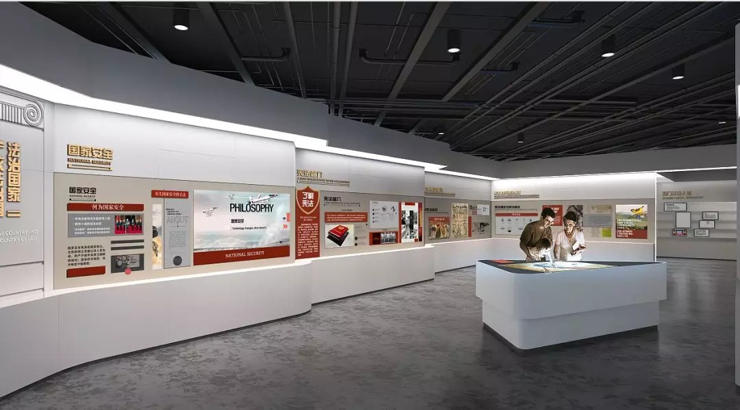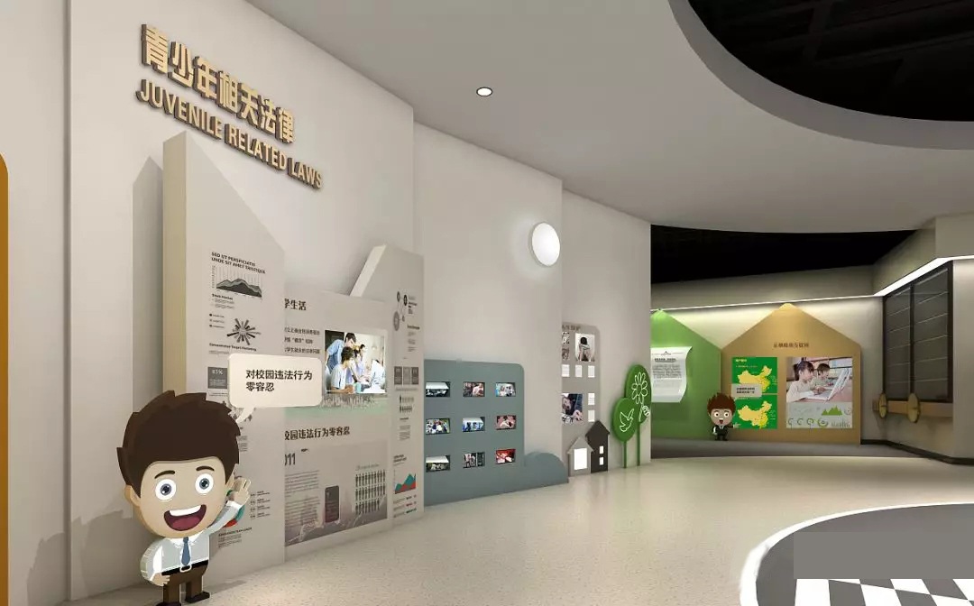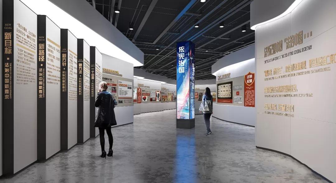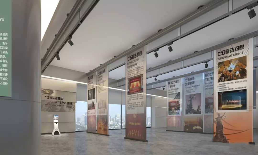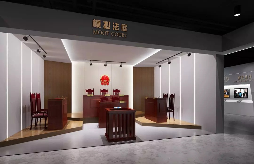 在展廳中融入多種設(shè)計元素,在設(shè)計中體現(xiàn)新的綜合觀念、人本觀念、生態(tài)觀念、系統(tǒng)觀念、信息觀念、高科技觀念。將模擬法庭融入展廳的設(shè)計中,充分發(fā)揮空間想象,讓設(shè)計獨具一格、創(chuàng)意新穎的展廳,帶動法治知識走進(jìn)生活。