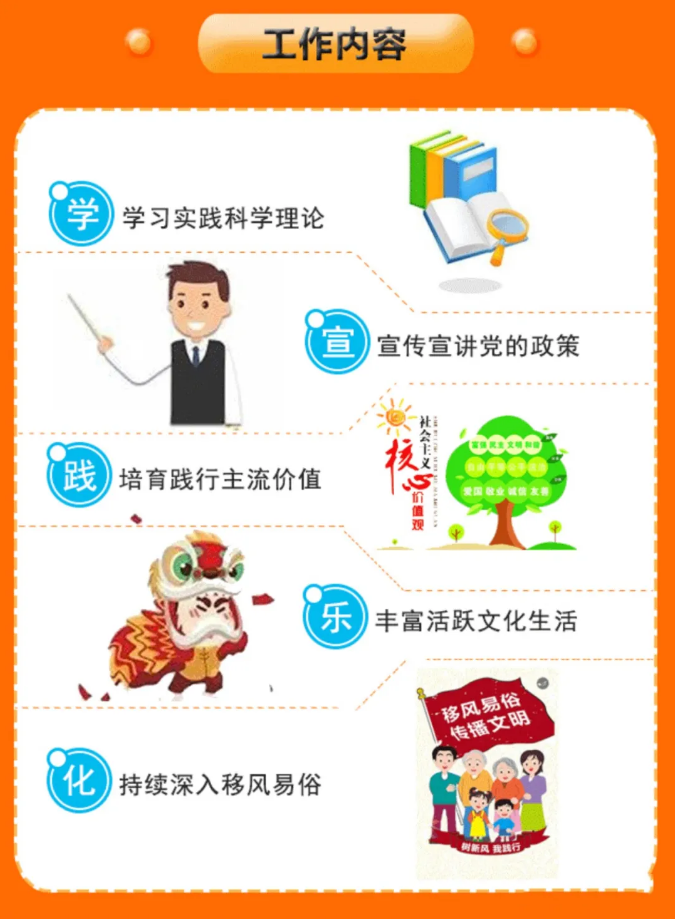 “講”:全面深入宣講。采取集中輔導(dǎo)報(bào)告、講座、培訓(xùn)或分散小型、面對(duì)面的咨詢(xún)、訪(fǎng)問(wèn)、懇談、交心、拉家常等形式,宣講理論政策,倡樹(shù)文化道德。