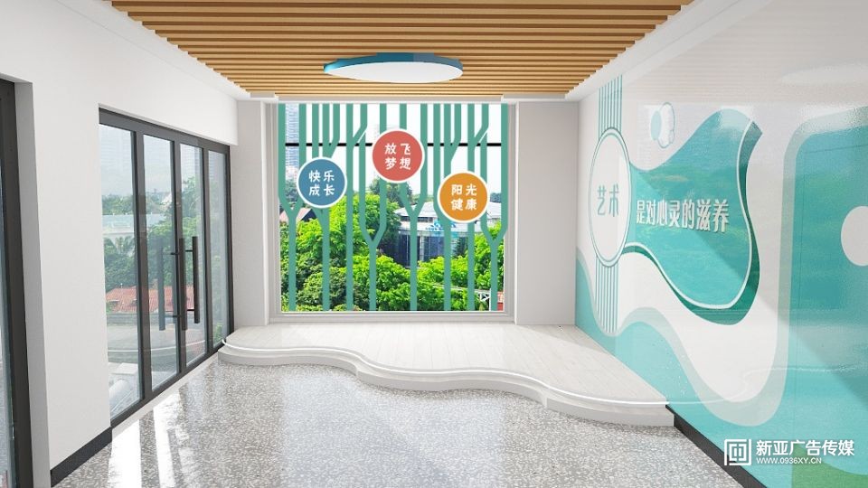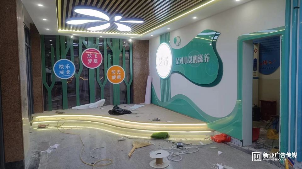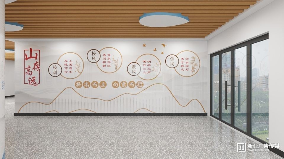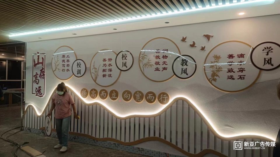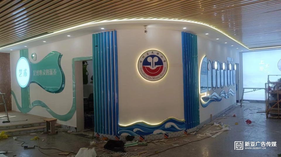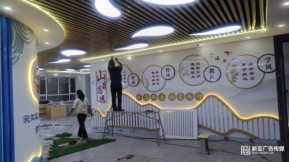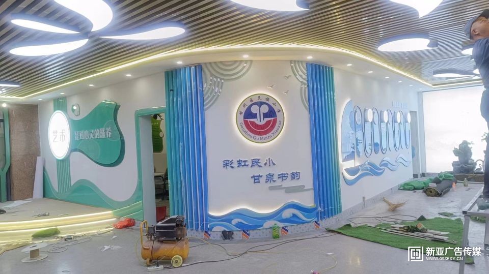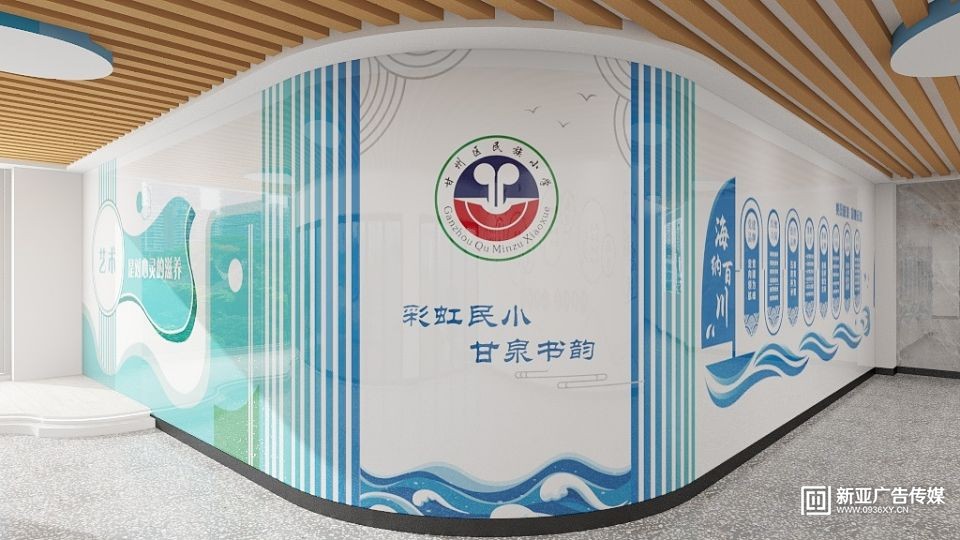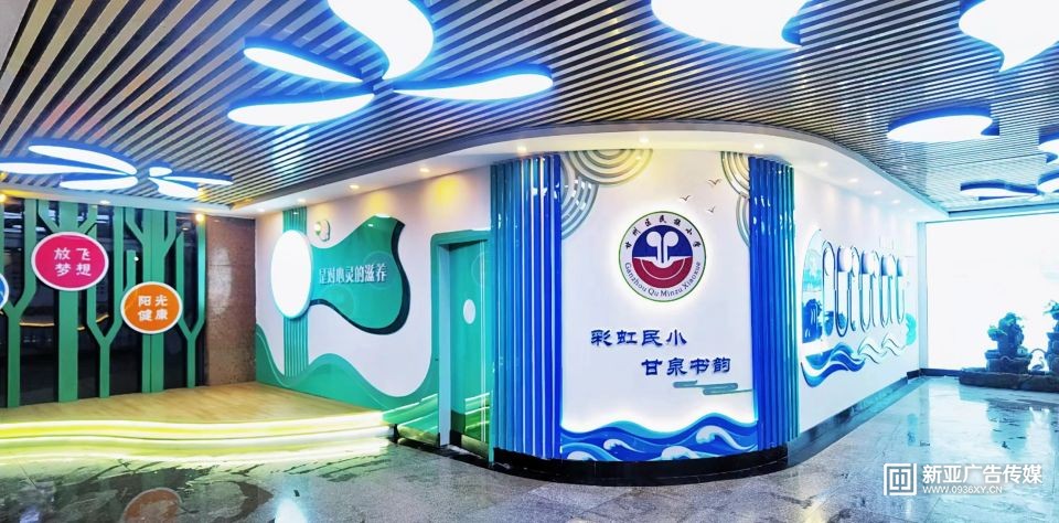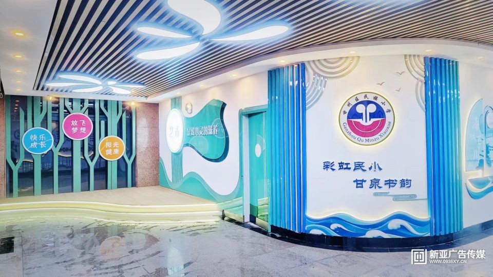 甘州區(qū)民族小學(xué)教學(xué)樓大廳設(shè)計施工一體化服務(wù),文化墻與建筑和燈光效果融合